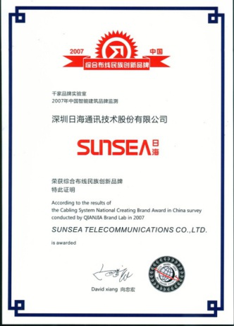 From November 29 to November 30, 2007, Sunsea Telecommunications Cabling was invited to Shanghai Guangda Convention & Exhibition Center Hotel for participation in the "2007 China International Building Intelligence Summit and Award Ceremony " which was organized by 1000 Net and won the " Cabling System National Creating Brand "special award.